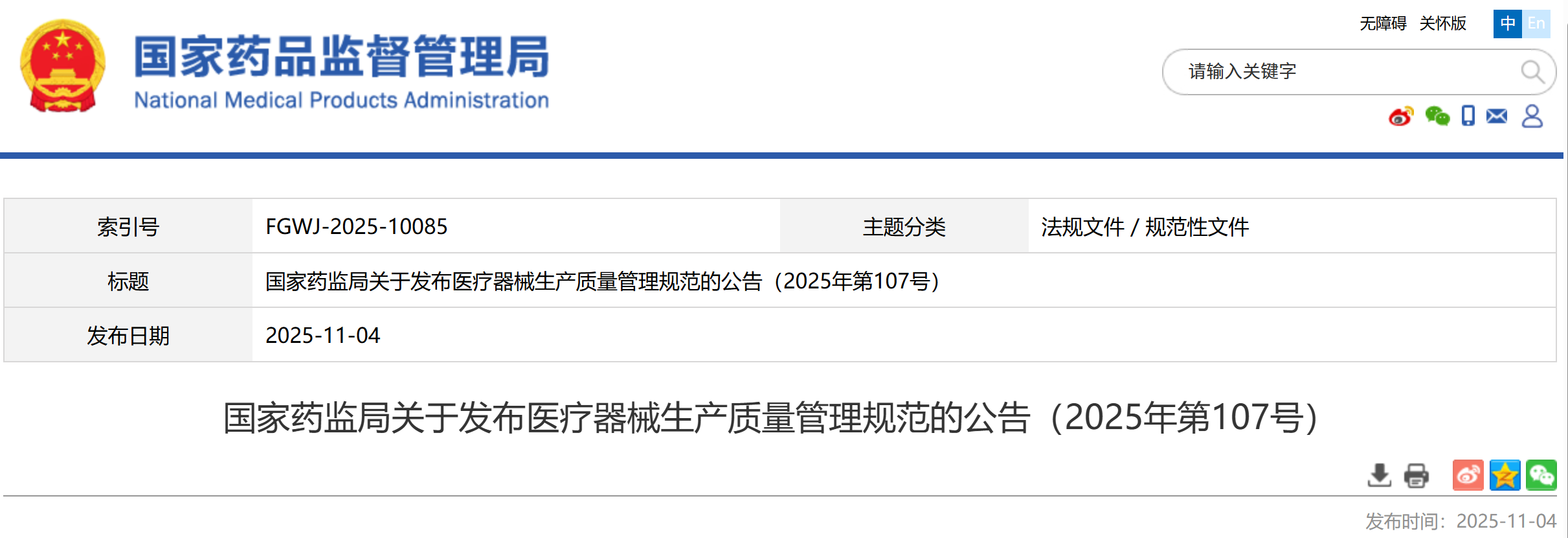 原文链接:国家药监局关于发布医疗器械生产质量管理规范的公告(2025年第107号)